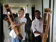 Ich stoppe meine IchgreifmireinenFarbtopf-Gedanken und frage nach, warum an fast jedem Bett vier Stöcke an den Ecken befestigt sind. Vielleicht für Infusionen? „Die sind für die Moskitonetze, die in der Nacht darüber gelegt werden. Die Fenster hier sind mit Absicht nicht vergittert, damit sich die Menschen angewöhnen, unter Netzen zu schlafen, um es dann auch im Dorf zu tun. Der Erfolg ist allerdings mäßig, ganz einfach, weil es den meisten zu heiß und stickig unter dem Netz ist“, erklärt Klaus.