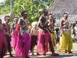 So stehen wir auf dem Dorfplatz, der eingefasst ist von wunderschön gearbeiteten Hütten aus Palmenblättern und Bambus, umringt von liebevoll angelegten Blumengärten. Schwarze Schweine liegen grunzend unter den Häusern, ein paar magere Hunde streunen umher und überall sind Kinder! Was man nicht sieht sind Autos, Fahrräder, Antennen auf den Dächern und Gardinen vor den Fenstern.