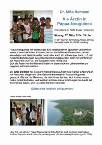 Dr. Silke Bertram hat in einem Krankenhaus auf der Insel Karkar Erahrungen mit Krankheit, Magie und dem Gesundheitswesen in Papua-Neuguinea gemacht. Wie sie, ihr Mann und die drei Kinder lernten, sich in einer neuen Kultur zurechtzufinden, und welchen Einfluss diese Erfahrungen bis heute auf ihre Familie haben, wird uns Silke Bertram berichten.