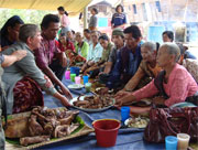 Gemäß eines klassischen Gaben-Tausch-Festes der Toba-Batak reichten wir speziell angerichtetes Schwein- und Ziegenfleisch an Mutter und die Ältesten. Als Gegengabe erhielten wir von Mutter, den Tanten und Onkels Goldfisch und reichlich Segen in Form besonderer Tücher (Ulos).