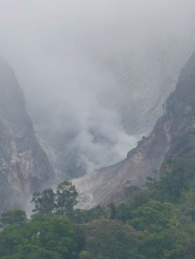 Der Vulkan Sibayak (Karo-Batak-Hochland) ist von Wolken verhangen, es ist Regenzeit