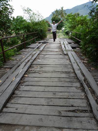 Westsamosir, Hans Ebinger liebt alle Straßen… insbesondere diese Holzbrücke auf Samosir. Will sagen, erfährt ohne Furcht hinüber!