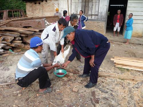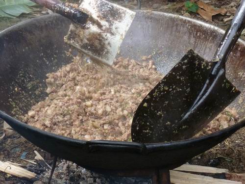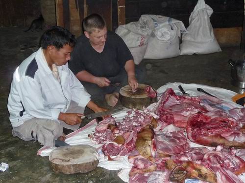 In der Nacht vor dem Fest wird das 60 kg schwere Schwein geschlachtet und das Fleisch kleingehackt. Eine typische Arbeit der Männer bzw. Boru, der Schwiegersöhne.