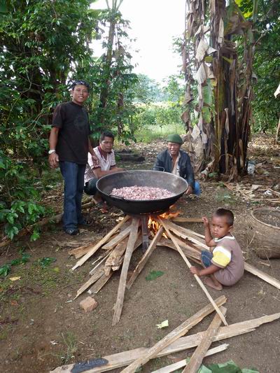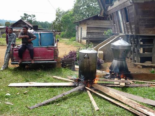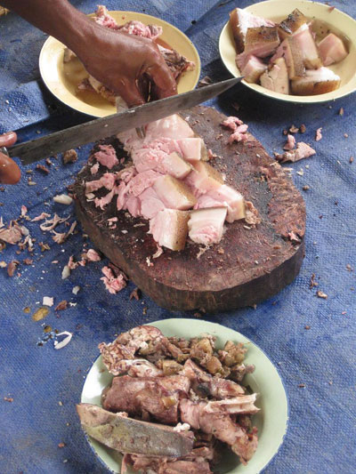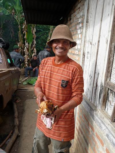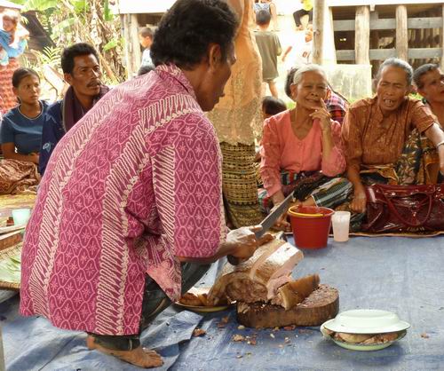Mein Pariban, ein „heiratbarer“ Cousin, zerteilt das Schwein in kleinste Portionen. Dies entsprechend des Ranges unter den Simalango-Ältesten und unseren hohen Onkeln (Tulang).
