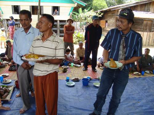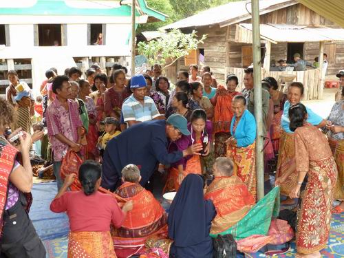Mutter und die Vertreter der Simalango-Sippe reichen uns Töchtern Fisch mit Gebeten und guten Wünschen. „Langes Leben, Erfolg, Glück und Reichtum – so lang und so golden wie der Fisch“.