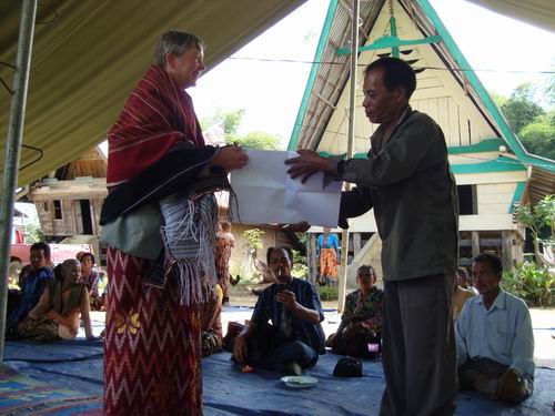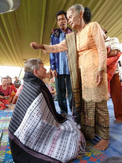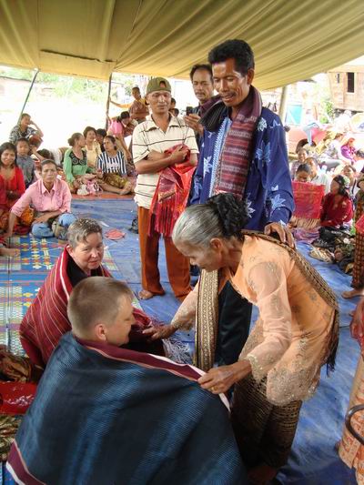 Mutter und ihr Sohn segnen mich und haben mir ein Ragi Hidup umgelegt, ein „Tuch des Lebens“. So geben es auch Brauteltern an ihre Tochter. Es wird mich auf meinen Lebensstationen begleiten und für Klarheit sorgen.