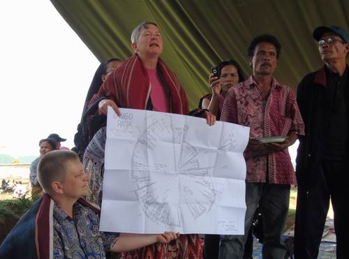 Ich überreiche eine handgezeichnete Kopie des Stammbaumes der Simalango. Er umfasst 12 Generationen und listet nur männliche Abkömmlinge auf. Das Original wurde ursprünglich von meinem Batak-Vater Ama ni Roma Simalango erstellt, ist aber verrottet.