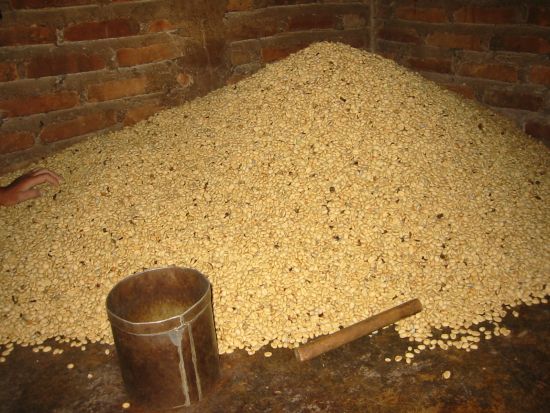 Auf der Rückfahrt, schwer beladen mit Kaffeesäcken, besuchten wir die Simalango Ursprungsdörfer Lumbanbolon und Paramparongan. Die Häuser wirklich ursprünglich – das erste Haus ist gratis von einer Familie bewohnt, die nächsten 3 sind vermutlich unbewohnt. Das andere Dorf ist gut bewohnt von zumeist ärmeren Verwandten, die das Schälen der Kaffeebohnen besorgen, was wir gleich alle ausprobiert haben. Es ging erstaunlich leicht mit dieser Radraspel, ohne die Bohnen zu verletzten. Aus zwei Häusern kamen rührende, sehr alte Männer, vermutlich Verwandte von Ihnen, die uns sehr herzlich begrüßten. Pernando zeigte uns die steinerne Urne im Gebüsch, in der Nähe eines wunderbaren Baumes. Die ganze Lokalität hatte eine sehr spezielle Atmosphäre wie ein „Kraft-Ort“, was nicht hinderte, dass ein Mann mit sehr archaischer Bambusleiter Früchte von einer Palme hoch oben für berauschenden Palmwein erntete.
