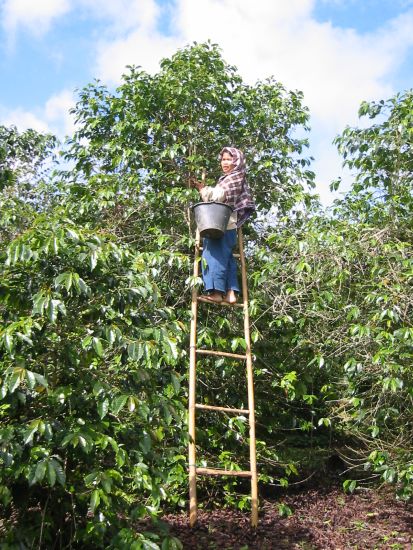 Dann fuhren wir mit Marisi, Pernando und Driver Junior in unserem Supergefährt zur Kaffeeplantage von Marisi, wo Marisi stolz seine Arabica-Kultur zeigte. Erstaunlich, wie viele Parasiten die Bohnen befallen. Die Bäume waren, soweit wir das beurteilen können, gut gepflegt. Gegenwärtig ist der Preis Rupiah 8’000 für 1 kg – vor einem Jahr betrug er Rupia 27’000. Abhängig vom Weltmarkt und den Warenterminbörsen beläuft sich die Schwankungsbreite für die Produzenten bis zu 300%, für die Konsumenten in unserer Hochpreisinsel Schweiz jedoch höchstens bis zu 20 - 30%. Je tiefer der Erzeugerpreis, desto höher der Gewinn für Zwischenhändler und Endverarbeiter. Es steht also für die Kaffeepflanzer nicht rosig mit dem Ertrag. Auf dem Rückweg schulterten Marisi und Pernando die 15 kg schweren Kaffeesäcke auf dem Kopf. Da kam das tolle Telefonat von Ihnen direkt aus Deutschland zu uns aufs Feld. „Christina!“ Marisi zog sein Handy hervor, welches aussah wie ein Kriegsveteran mit vielen Pflastern zusammengehalten. Er wolle spontan zurückrufen, dann fiel ihm ein, dass das doch etwas teuer sei.