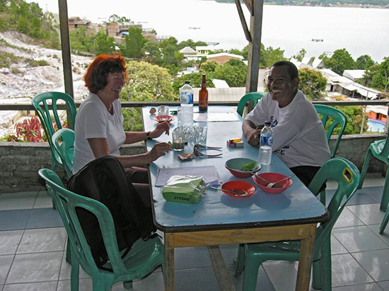 Zu Fuß heimgekommen (das Wort sagt schon etwas über unsere guten Gefühle in dieser Familie), war das von Eda zubereitete Abendessen parat – wir freundlicherweise mit Marisi und Pernando am Tisch auf Sesseln, – wir saßen etwas wie auf der Bühne. Ompung, Eda und ihre beiden Mädchen und Nico am Boden. Alle Töpfe doppelt. Ein „Sonntagsmahl“, schmackhafter Fisch, Huhn, Reis, Chilli (Christina habe Chilli auch so gerne) und was selten ist, Papaya. Auch abgekochtes warmes Wasser wurde zum Trinken bereitet aus dem neuen japanischen vollautomatisierten elektrischen Wasserkocher, den die Familie immer benutzt. Vor dem Essen stand Ompung mit Hilfe der Kinder unerwartet auf und hielt sehr aufrecht eine richtig würdevolle Ansprache (die wir zu gern verstanden hätten). Ich versuchte auf ebenso würdige Weise die Beziehung von Christina zur Sippe zu beleuchten, soweit ich sie aus unserer Korrespondenz heraus destillieren konnte. Pernando hat ein wenig übersetzt. Dann betete Fernando ein schönes englisches Gebet und bat uns auch zu beten. Au weia – wir halfen uns auf Deutsch mit einem etwas individualisierten Vaterunser.