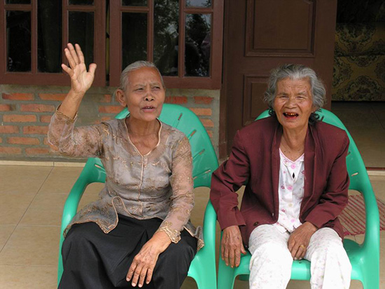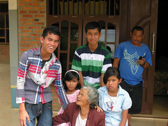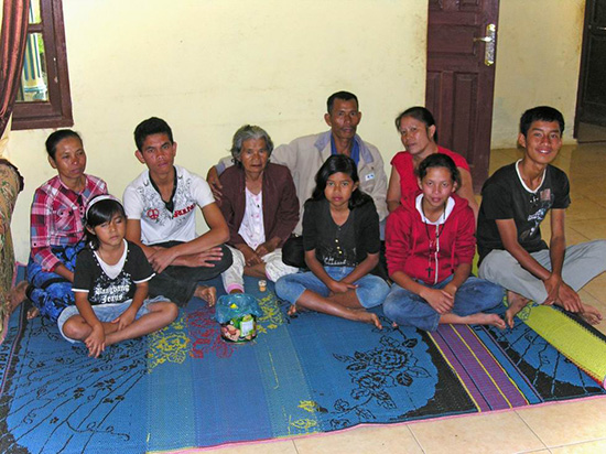Da ist zuerst Ompung, diese winzige, auf den ersten Blick zerbrechlich, etwas schwach und ziemlich alt wirkende Frau mit vom Betelgenuss blutrot gefärbten Mund auf der Matte am Boden sitzend, entpuppte sich bei genauerer Betrachtung eindeutig als Herrin des Hauses, Machtzentrum der Familie und bestimmende Chefin der Großfamilie. Klar, wollte sie damals die Heiratsurkunde (Eintragung einer Lebenspartnerschaft) von Christina sehen! Ompung verfügt möglicherweise auch über die meisten materiellen Ressourcen! Ihr Blick und ihre Aufmerksamkeit wurden je länger wir da waren, immer lebendiger und wacher. .Sie wurde von allen Mitgliedern der Familie, Klein und Gross, hoch geachtet und unglaublich liebevoll umsorgt. Gerade auch von der neuen Schwiegertocher „Eda“, Marisis zweiter Frau.