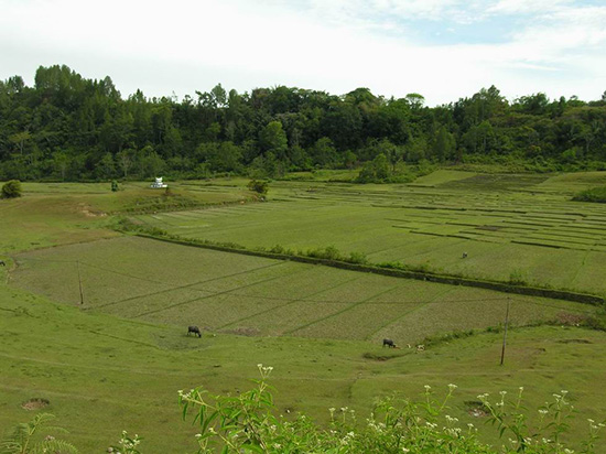 Am nächsten Morgen nach reichlichem Frühstück gingen wir ein wenig in der wunderschönen reinen Landschaft spazieren, Büffel weideten, ein reizendes junges Mädchen begegnete uns mit Stöckelschuhen auf dem Motorrad, später nochmals. Sie begrüsste uns in traditionell respektvoller Art und hielt mich dann mal einfach fest – ihre Reihe Geschwister als Zuschauer. Es war zum Lachen. Wir beendeten diese freundliche kleine Gefangenschaft mit dem Hinweis auf die Kirche. Ich probierte zu Hause noch den Sarong, Ompung meinte, es geht auch ohne und deutete lachend kurze Hosen an, die Christine mal getragen habe.