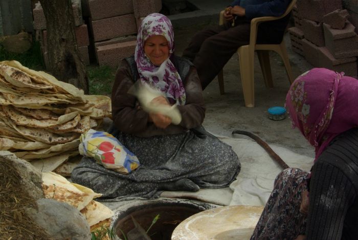 Am naechsten Morgen begruesst uns die Sonne und wir haben kaum unseren tuerkischen Kaffee auf dem Kocher gekocht, da winkt uns die Frau von gestern. Sie ist die Baeckerin im Dorf und backt in einem einfachen Erdofen grosse Fladenbrote. Obwohl ich eigentlich nicht so müchte, drueckt sie mir 3 Brote in die Hand. Wer kann soviel Brot essen?