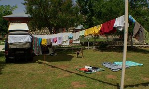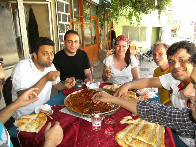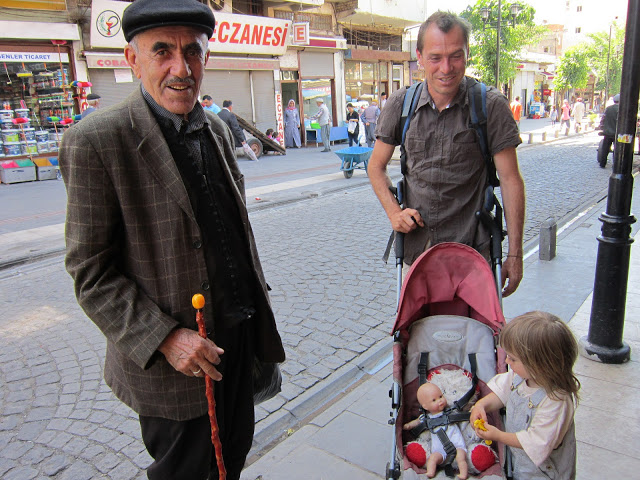 Wir finden recht schnell einen bewachten Parkplatz in einem Hinterhof in der Altstadt, fragen, ob wir uebernachten koennen, die Antwort ist mal wieder ein Chay. Nach 3 Chays kommt einer der Maenner mit einer grossen Pfanne eines Lammgerichts, die anderen Maenner setzen sich im Kreis um die Pfanne und wir werden gebeten, uns doch dazuzusetzen und mitzuessen. So lernen wir schon mal das kurdische Wort fuer 'Danke'. Das werden wir in der Stadt noch oefter brauchen, staendig gibt es fuer die Kinder etwas geschenkt, als wir ueber den Markt schlendern, finden wir einen Laden, der Seile verkauft. Wir wickeln 4 m ab fuer unsere Haengematte und fragen nach dem Preis. Der Mann zeigt auf Vasco und meint: for him.