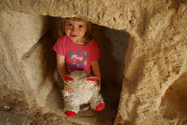Das Freiluft-Museum in Goereme ist Weltkulturerbe und wir treffen vor dem Eingang Conrad und Franzi mit ihren 2 Maedels, die auch hier angekommen sind. Hier gibt es einige in den Fels gebaute Kirchen und Wohnraeume anzuschauen und die Kinder freuen sich, sich wiederzusehen. Vasco und Frieda reiten sogar unfreiwillig zusammen auf einem Kamel, sie wollten es nur streicheln und mal draufsitzen und ehe ich richtig hinschaue, steht das Kamel auf und reitet davon. Natuerlich soll das ganze jetzt 5 Euro kosten, sowas!