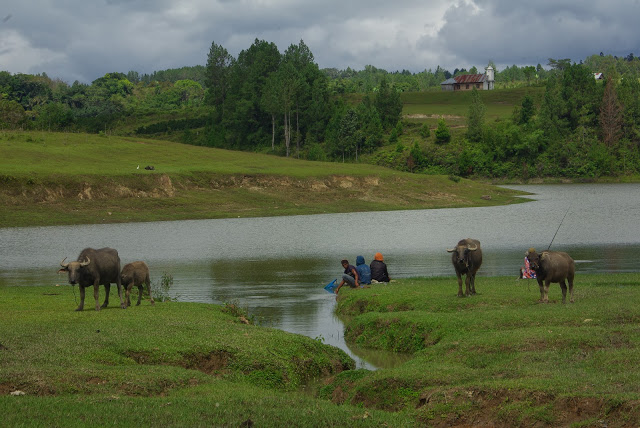 Am naechsten Morgen scheint die Sonne, wir finden die Strasse und eine Stunde spaeter sehen wir den kleinen See. Bapak Mikhael, Christines Bruder kommt schon mit dem Roller angefahren und zeigt uns den Weg. Kurze Zeit spaeter parken wir vor dem Adat-Haus inmitten von Wiesen mit Wasserbueffeln. Christine's Mutter begruesst uns und wir trinken erst mal einen Kaffee. Die Leute hier leben vorwiegend vom Kaffee-und Reisanbau. Wir werden sofort herzlich in die Familie aufgenommen, die Annahme, wir muessen uns hier selbst versorgen, war grundverkehrt, wir haben Vollpension! Beim Abendessen sitzen ohne uns schon 10 Personen am Tisch, alles Kinder und Enkelkinder. Viele alte Menschen in Deutschland wuerden sich einen solchen intakten Familienverband wuenschen.