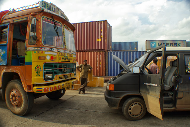 Es daemmert schon, als wir den Bus endlich in den Container fahren, festzurren koennen wir erst morgen, da die dafuer zustaendige Person erst Material besorgen muss, das heisst, morgen nochmal das gleiche Spiel. Der Container wird vorlaeufig versiegelt, aber auch nur, weil wir darauf bestehen. Um 9 Uhr abends sind wir zurueck in Chennai.