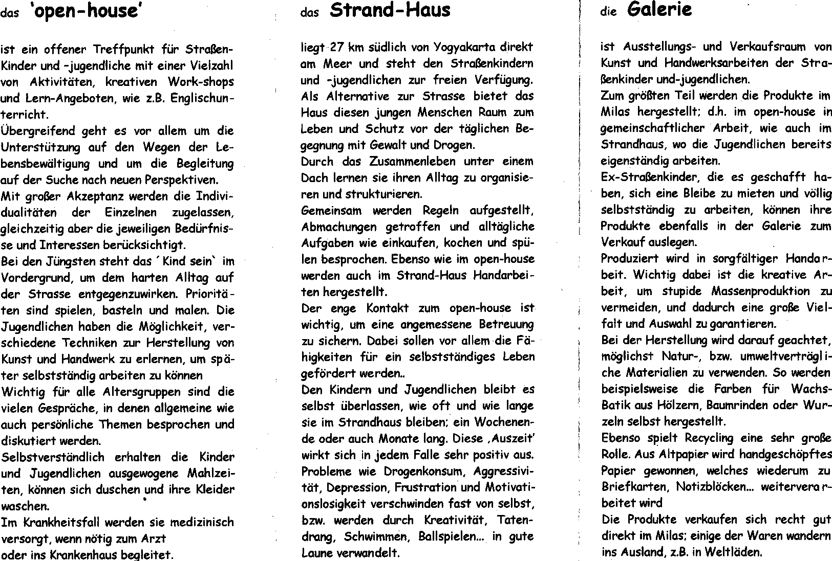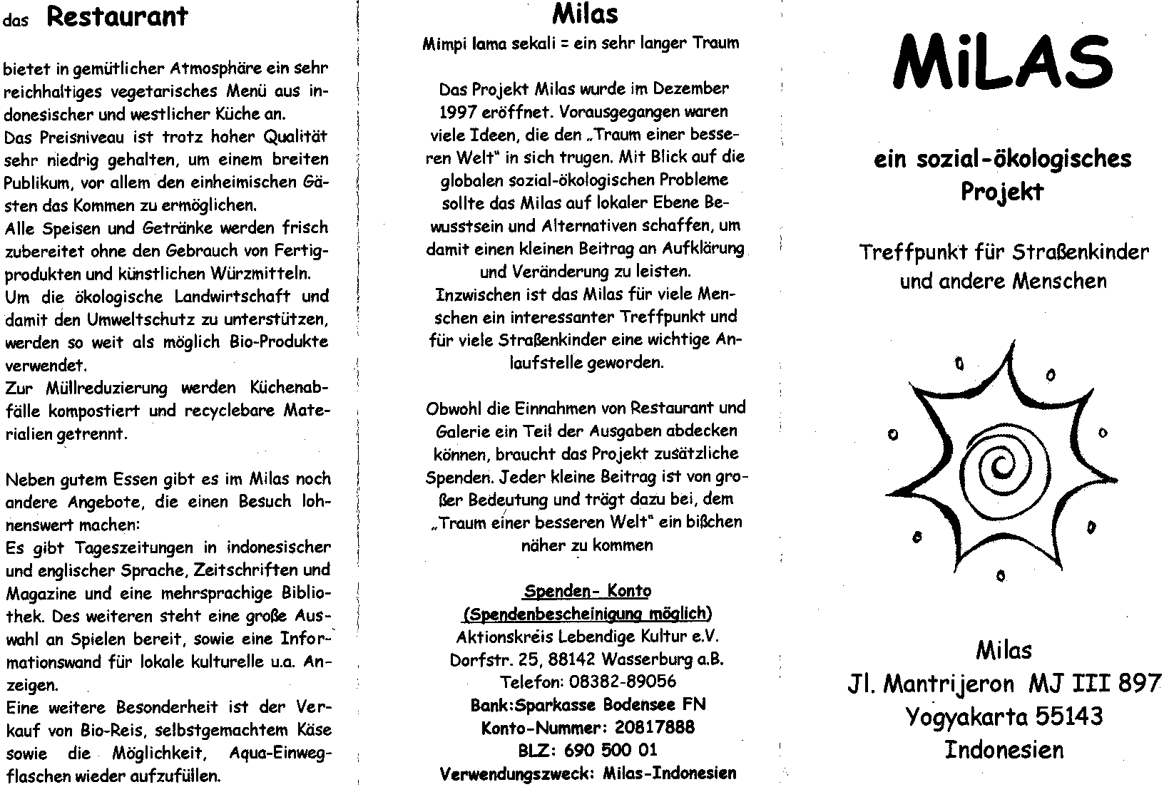 Das Projekt MILAS wurde im Dezember 1997 eröffnet. Vorausgegangen waren viele Ideen, die den "Traum einer besseren Welt" in sich trugen.... Das Restaurant bietet in gemütlicher Athmosphäre ein sehr reichhaltiges vegetarisches Menü aus indonesischer und westlicher Küche an. Mehr dazu im Flyer rechts (Klick-Vergrößerung)
