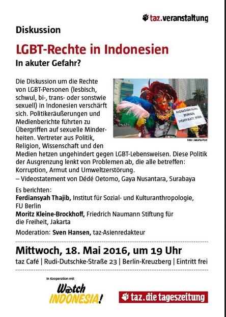 Der Sidihoni-Verlag empfiehlt und unterstützt die Veranstaltung & Diskussion am 18. Mai in Berlin. Wir sind Mitglied bei Watch Indonesia e.V.! seit den ersten Tagen der Gründung dieses Menschenrechts-Vereins. Wir hoffen, die politische Führung Indonesiens wird sich den wahren Problemen des Landes zuwenden und nicht weiterhin mit Ausgrenzung und Verfolgung von Minderheiten, aktuell von Lesben, Schwulen, trans- und bisexuellen Menschen, ablenken. Wir wünschen eine erfolgreiche Veranstaltung der TAZ die Tageszeitung mit Watch! und allen Gästen.