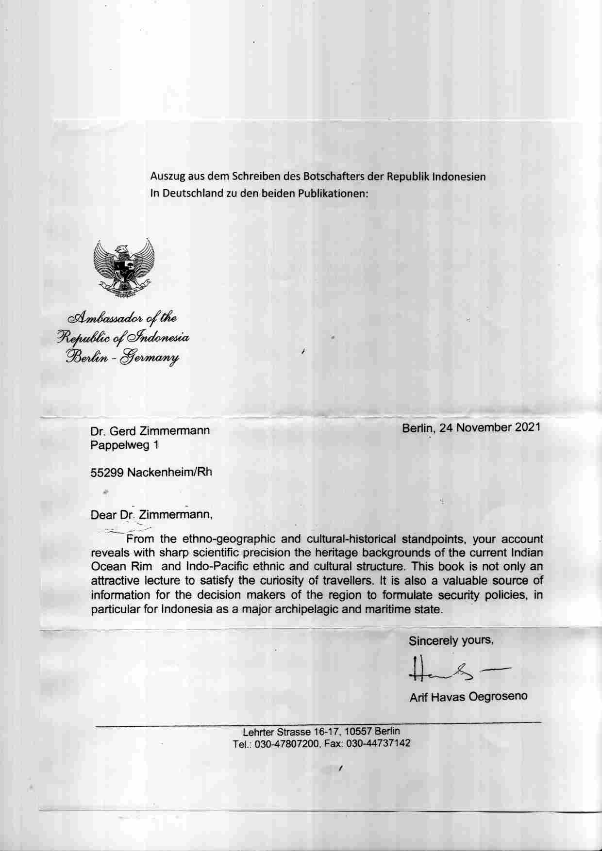 Auszug aus dem Schreiben des Borschafters der Republik Indonesien in Deutschland zu den beiden Publikationen