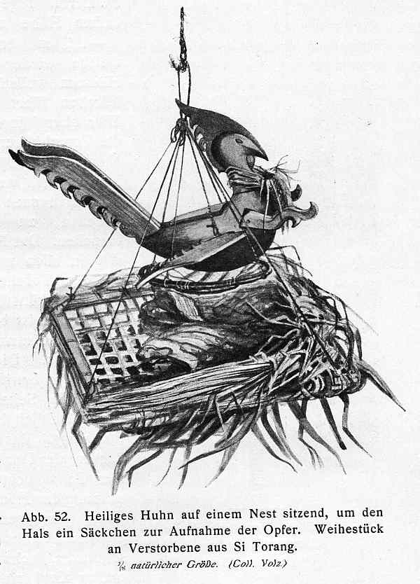 Heiliges Huhn auf einem Nest sitzend, um den Hals ein Säckchen zur Aufnahme der Opfer. Weihestück an Verstorbene aus Sitorang.