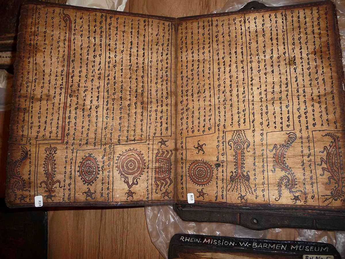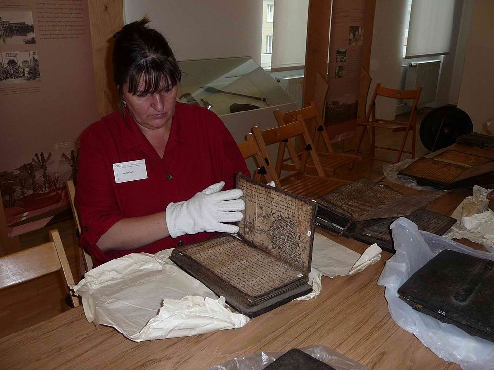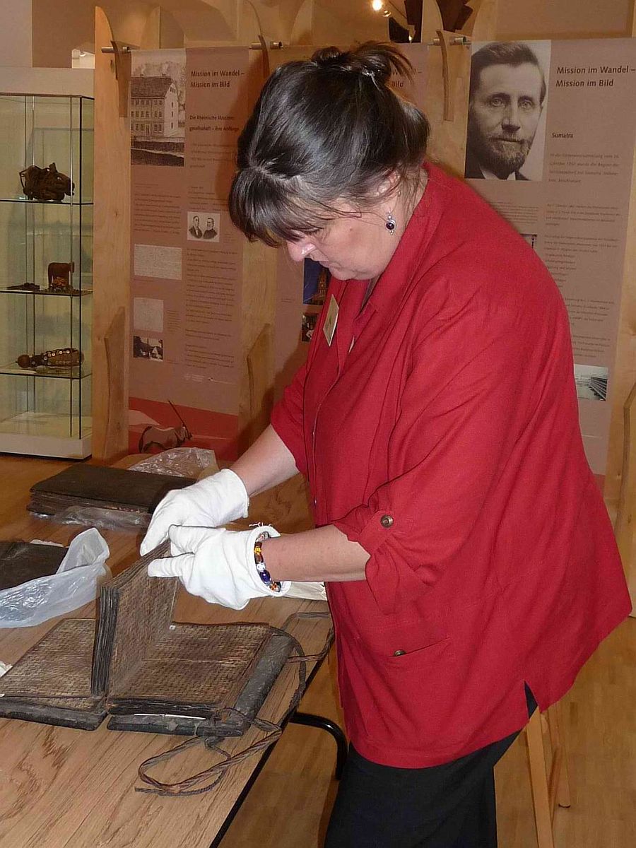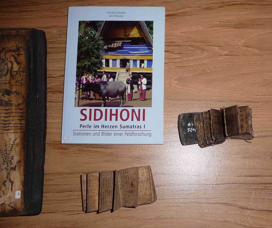 Ganz besondere Schätze liegen zum Schutz im klimatisierten Archivkeller des Museums. Auf Wunsch und mit begründetem Forschungsinteresse zeigt die Museumsbetreuerin, hier Frau Mohr, die Pustaha (Sanskr. pustaka), die Bücher der Batak aus Baumrinde. Sie waren quasi die Notizbücher der Spezialgelehrten der Batak, genannt Datu. Datu erlernten in ihrer exquisiten Lehre bei einem lokalen Meister die Zeichen der alten Batakschrift. Als schrift- und schreibkundige Priester-Elite gaben sie in diesen Büchern ihr magisch-religiöses Wissen unter sich weiter, begonnen von Rezepturen gegen Krankheiten, Kalenderinterpretationen, Beschwörungsriten zur Beeinflussung von Menschen, Geistern, Seelen, Verstorbenen und Ahnen, zum Zwecke der Kriegsführung oder Heilung. Sie waren die Spezialisten zum Verleihen magischer Kräfte an Zeremonial-, Prestige-, Schutz- und Kriegsgeräte.