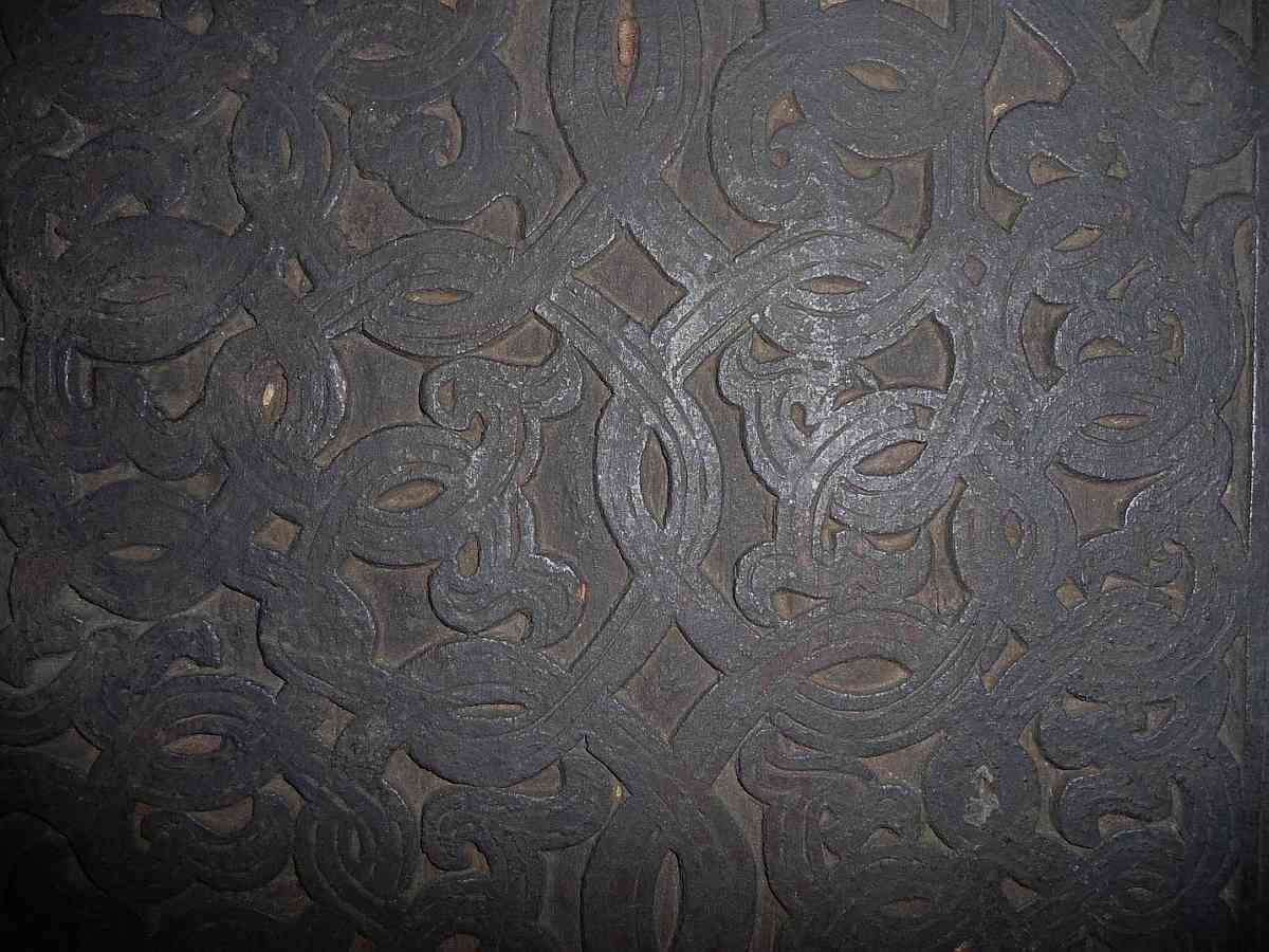 Verschiedene Größen der Pustaha-Bücher im Vergleich. Rechts ein Ausschnitt des massiven Holzdeckel-Einbandes, der mit geschnitzten Blütenranken verziert wurde. © Schreiber